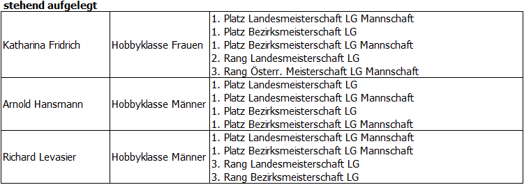 Neben dem erfreulichen Abschluss der Landesliga und der erfolgreichen Teilnahme an verschiedenen Cupbewerben, dürfen wir heuer 12 Schützen zu Meisterschaftsmedaillen in den Klassen Luftgewehr und Kleinkaliber gratulieren und für die Zukunft ein kräftiges Schützenheil wünschen: