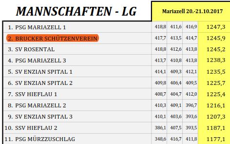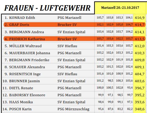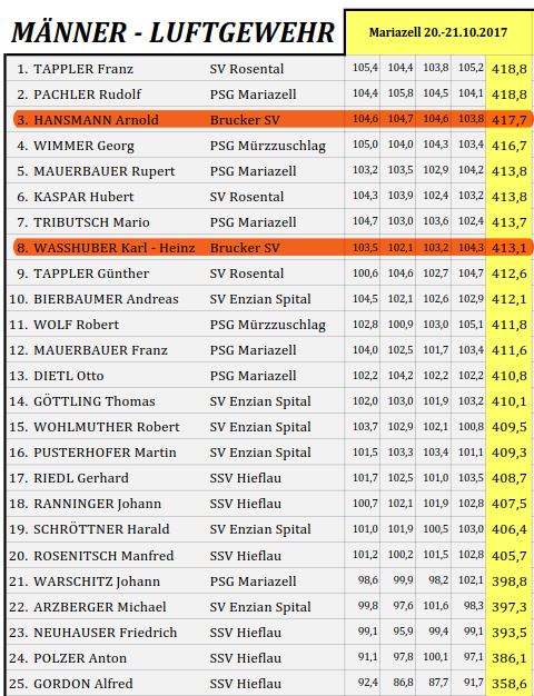 Auf einen erfolgreichen Start in die Luftgewehrsaison können unsere STA-Schützen in der 1. Runde des Obersteiermark-Cups, ausgetragen von 20.-21.10. in Mariazell, verweisen. Alle 4 SchützInnen starten mit erfolgversprechenden Ergebnissen den ersten Rundenwettkampf der Saion. Neben unseren Routiniers OSM Arnold Hansmann und Katharina Fridrich können die beiden Newcomer des Vereins, Doris Graf und Karl-Heinz Wasshuber positiv überraschen. Doris setzt sich mit starken 414,7 Ringen auf Rang 2 nach der ersten Runde, Karl-Heinz mit 413,1 auf Rang 8. Für die Mannschaftswertung bedeutet das den aussichtsreichen 2. Rang.