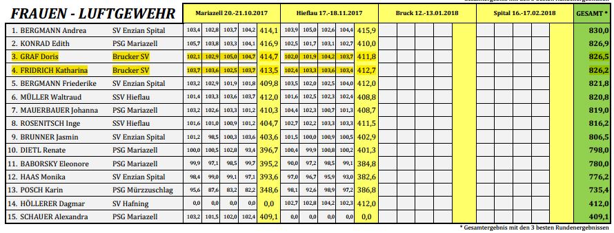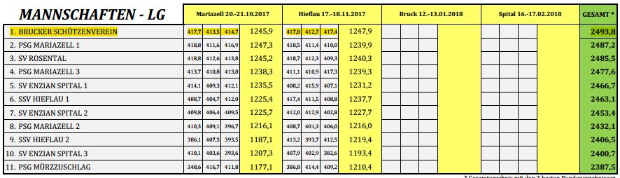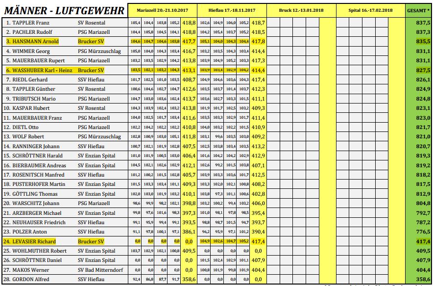 Vom 17.-18.11. fand in Hieflau die 2. Runde des OStmk-Cups statt und der Brucker SV kann auf ein sehr erfreuliches Zwischenergebnis verweisen. Besonders die starken 417 Ringe von Richard Levasier sichern der Mannschaft Zwischenrang 1 in der Wertung:
