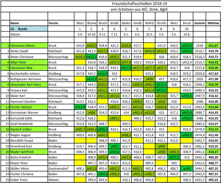 Knapp 40 SeniorInnen nehmen an den Freundschaftsschießen der SenIII, welche über 10 Runden von September bis Juni von Vereinen aus NÖ, Stmk und Bgld ausgetragen werden, teil. Heuer dürfen wir uns mit Maria Hansmann vom Brucker Schützenverein über den Sieg freuen und gratulieren herzlich! Über die gesamte Saison hinweg zeigte sie ihre Konstanz. Zum Vergleich: ihr Streichresultat hätte als Schnitt immer noch für den 10. Gesamtrang gelangt!
