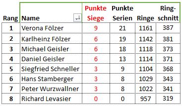 Nach 3 Runden der Vereinsmeisterschaft kristallisieren sich erste Duelle um Platzierungen heraus. Während Verona mit Respektabstand vor Karlheinz den ersten Platz einnimmt, geht es von den Plätzen 3-5 durchaus knapp her! Der Ringschnitt unterscheidet sich um nur 5 Ringe und lässt für die verbleibenden 4 Runden noch auf Spannung schließen, da die Konstanz in den Leistungen durchaus ausbaufähig ist. Aber auch im letzten Drittel der Tabelle gibt es um Platz 6 noch ein knappes Rennen – alles ist möglich, steigern sich die hier platzierten Schützen von Runde zu Runde doch deutlich in ihren Ergebnissen!