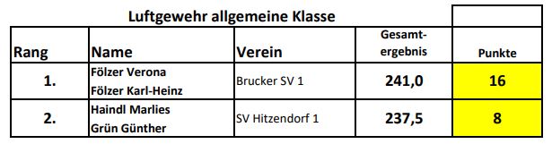 Das Vater-Tochter Duo mit Heinz und Verona Fölzer konnte den Grunddurchgang gewinnen und qualifizierte sich somit für das Gold Medal Match gegen den SV Hitzendorf. Nach einem spannenden Duell ging das Match 16:8 zugunsten der brucker Schützen aus.