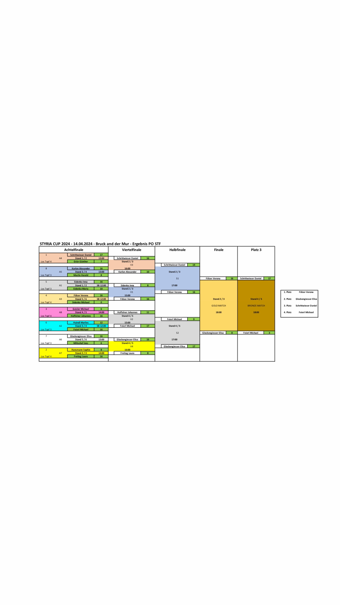 Nach einem Grunddurchgang mit 20 Schüssen wurden die Schützen entsprechend ihren Ergebnissen zu 4 Lostöpfe zugeordnet. Daraus ergaben sich die Begegnungen fürs 1/8 Finale.