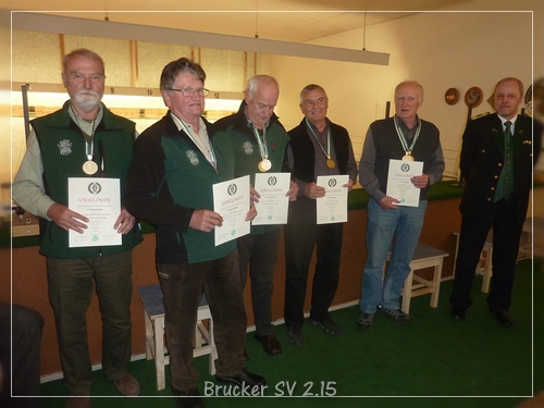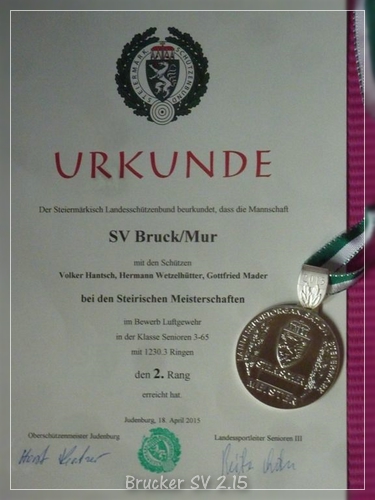 Bei den am 18.04.2015 in Judenburg ausgetragenen Landesmeisterschaften der Senioren kann der Brucker Schützenverein mit Stolz dem nächsten Landesmeister aus den eigenen Reihen gratulieren! Hermann Wetzlhütter gewinnt die Klasse SenIII65 mit hervorragenden 415,7 Ringen! Die Mannschaft Bruck/Mur (Hantsch/Mader/Wetzlhütter) erreicht ebenfalls in der Klasse SenIII/65 den tollen 2. Platz.