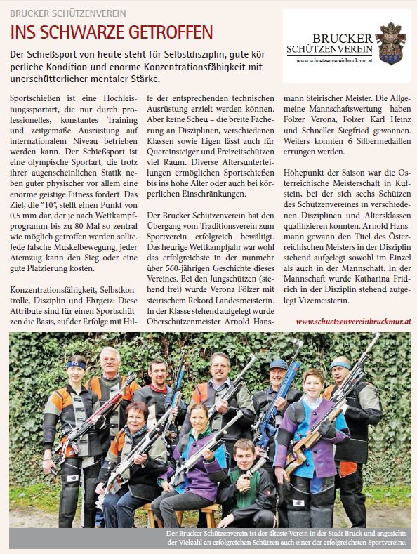 Allgemein Öffentlichkeitsarbeit 10 Jahren ago Manuela Mit einem ganzseitigen Artikel in den Brucker Stadtnachrichten 04-2016 stellt sich der Brucker Schützenverein der örtlichen Bevölkerung vor: Continue Reading Previous Wieder Landesmeistertitel für Bruck!Next Staatsmeisterschaft SenIII 2016 Schreibe einen Kommentar Antworten abbrechenDu musst angemeldet sein, um einen Kommentar abzugeben.